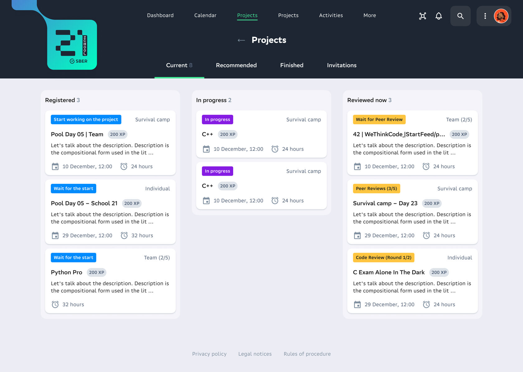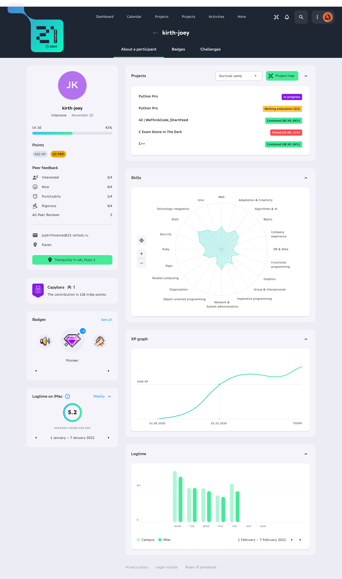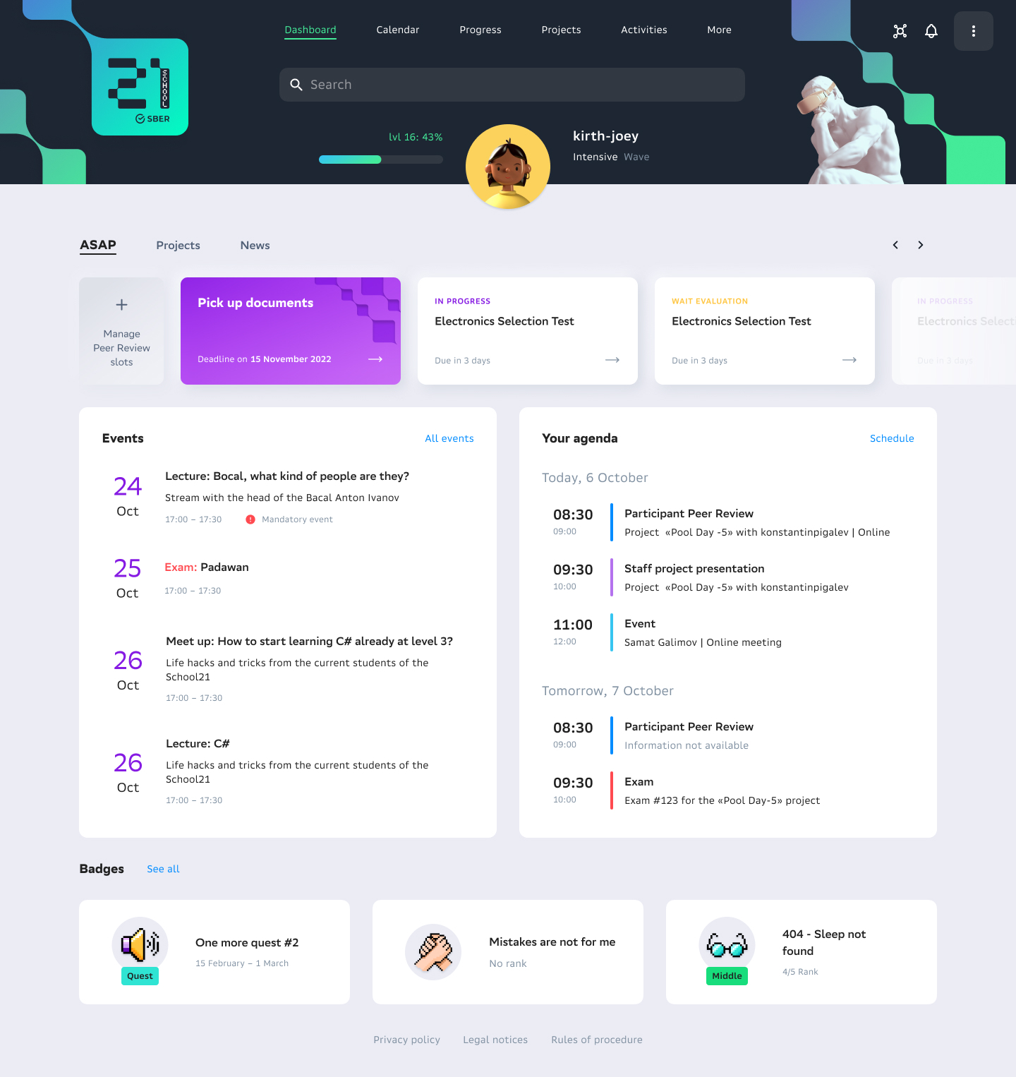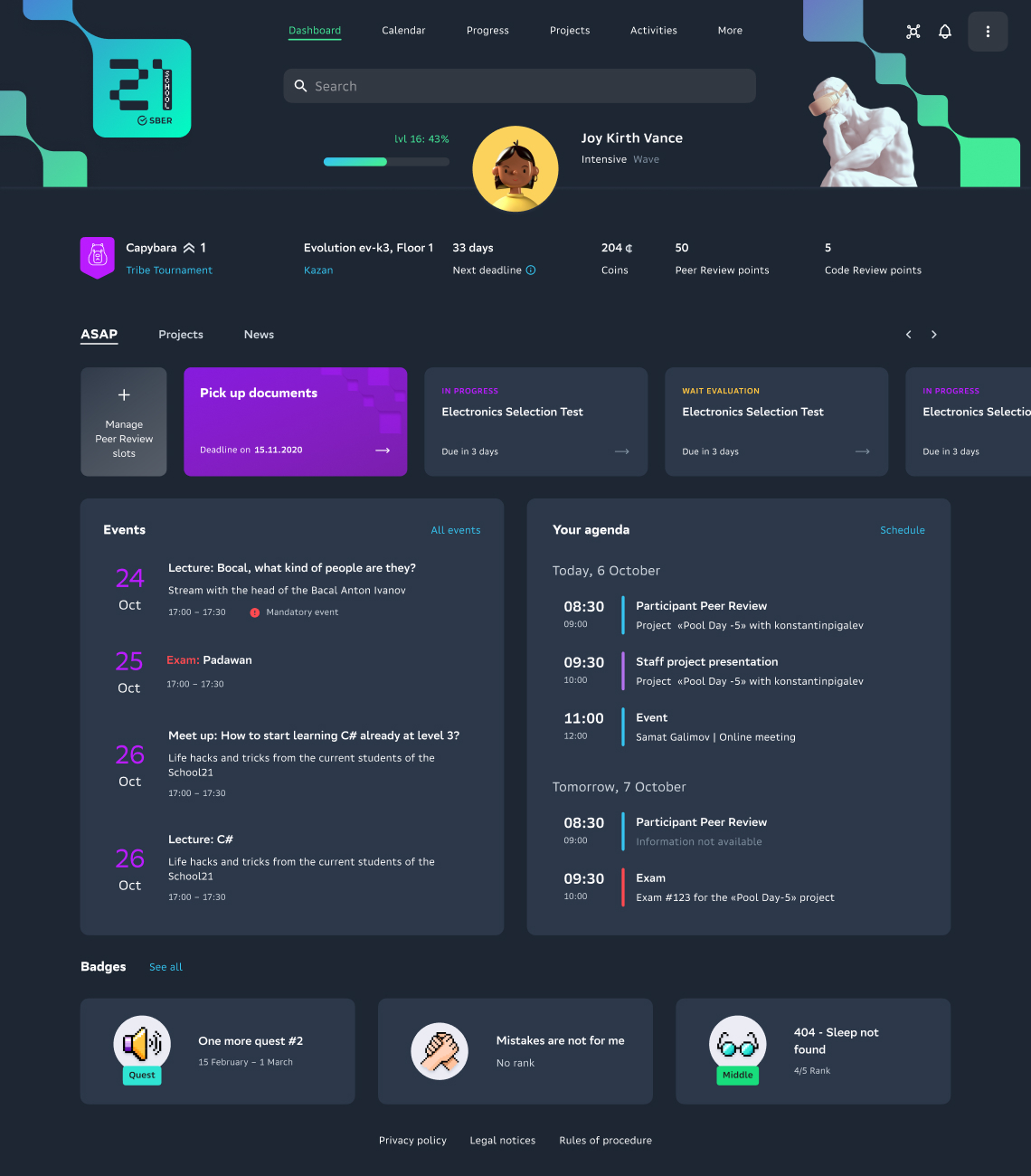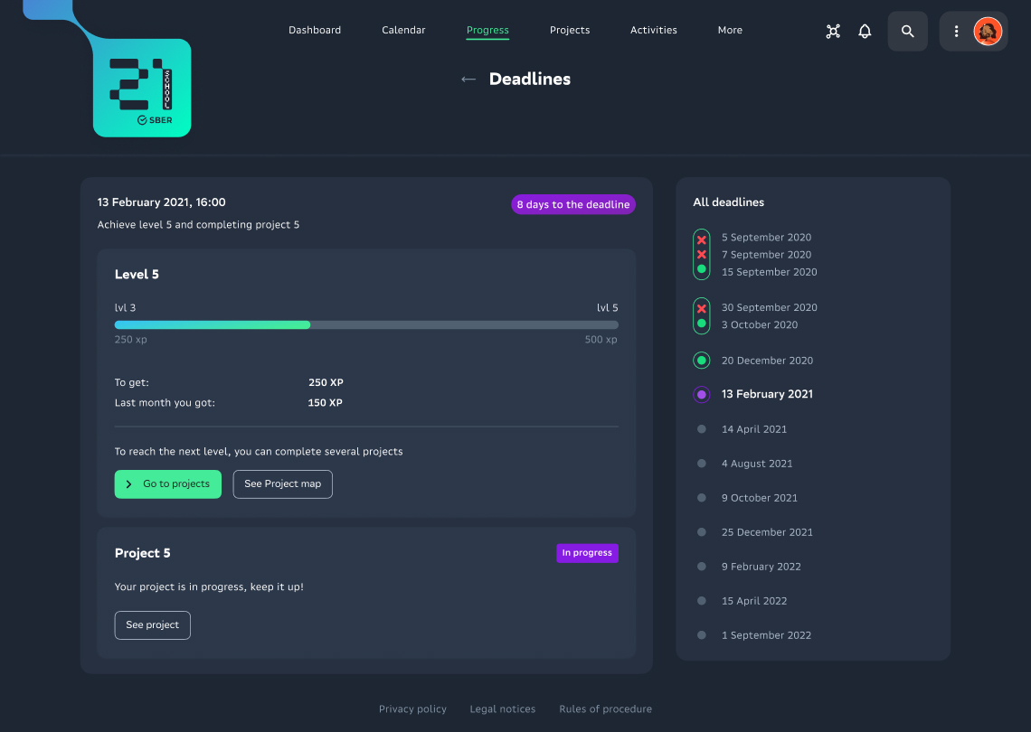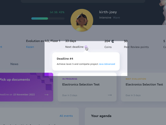 Большой упор делается на геймификации: у каждого студента свой уровень, который со временем растёт как в видеоигре.